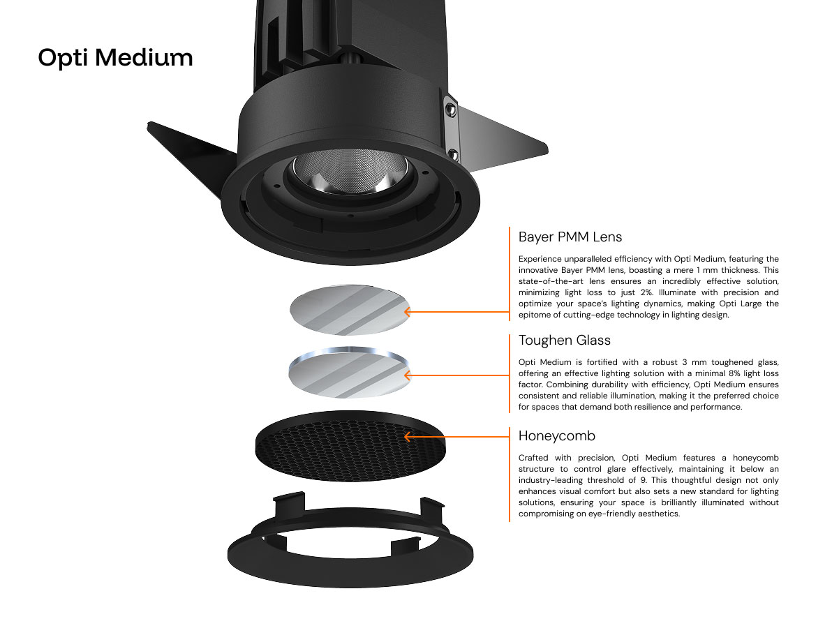 | 3000K | 35° | 19 W | 1730 lm | <9 | IP20/IP54 | 89 lm/W | Opti Medium Recessed 3K N |